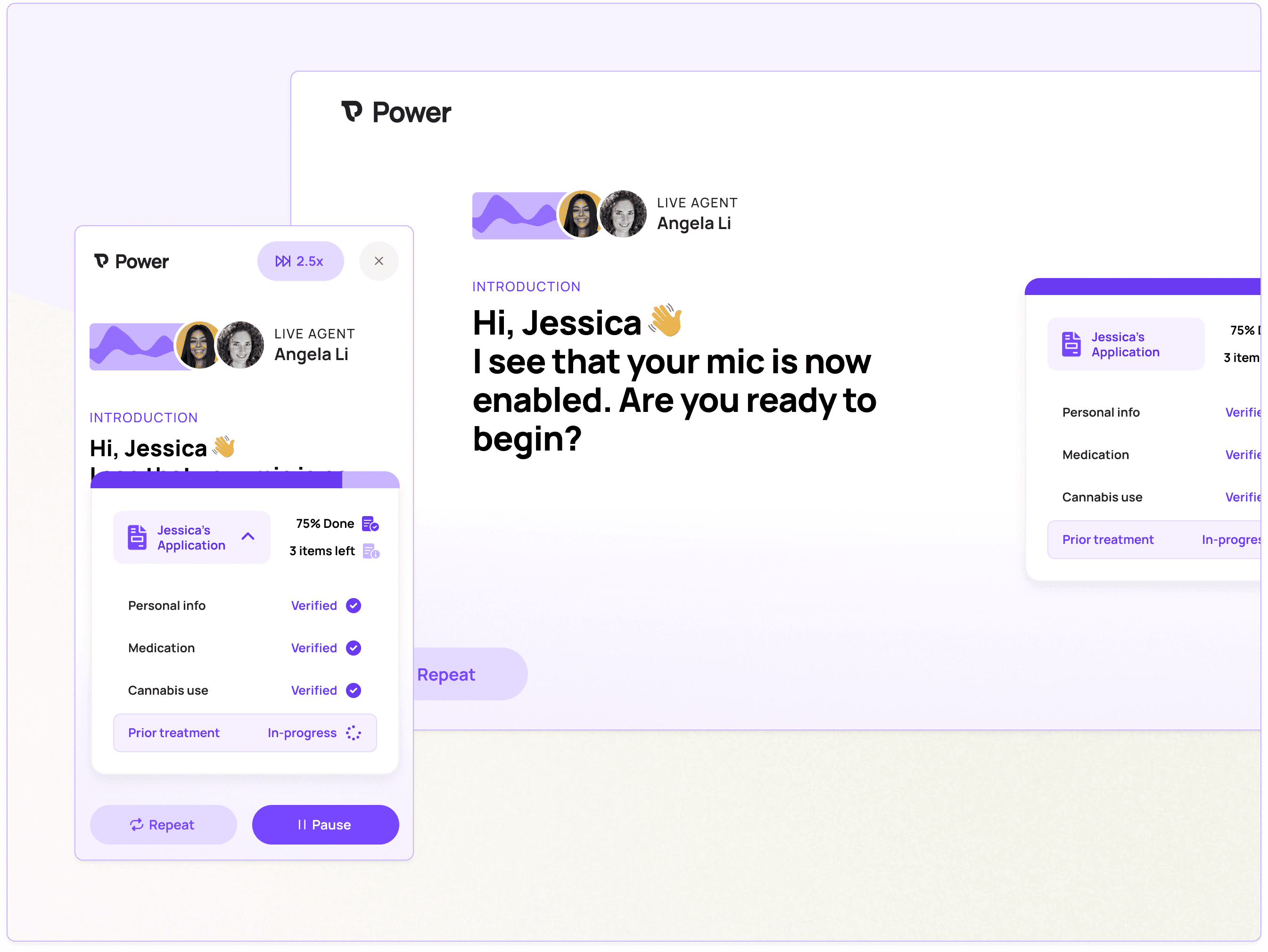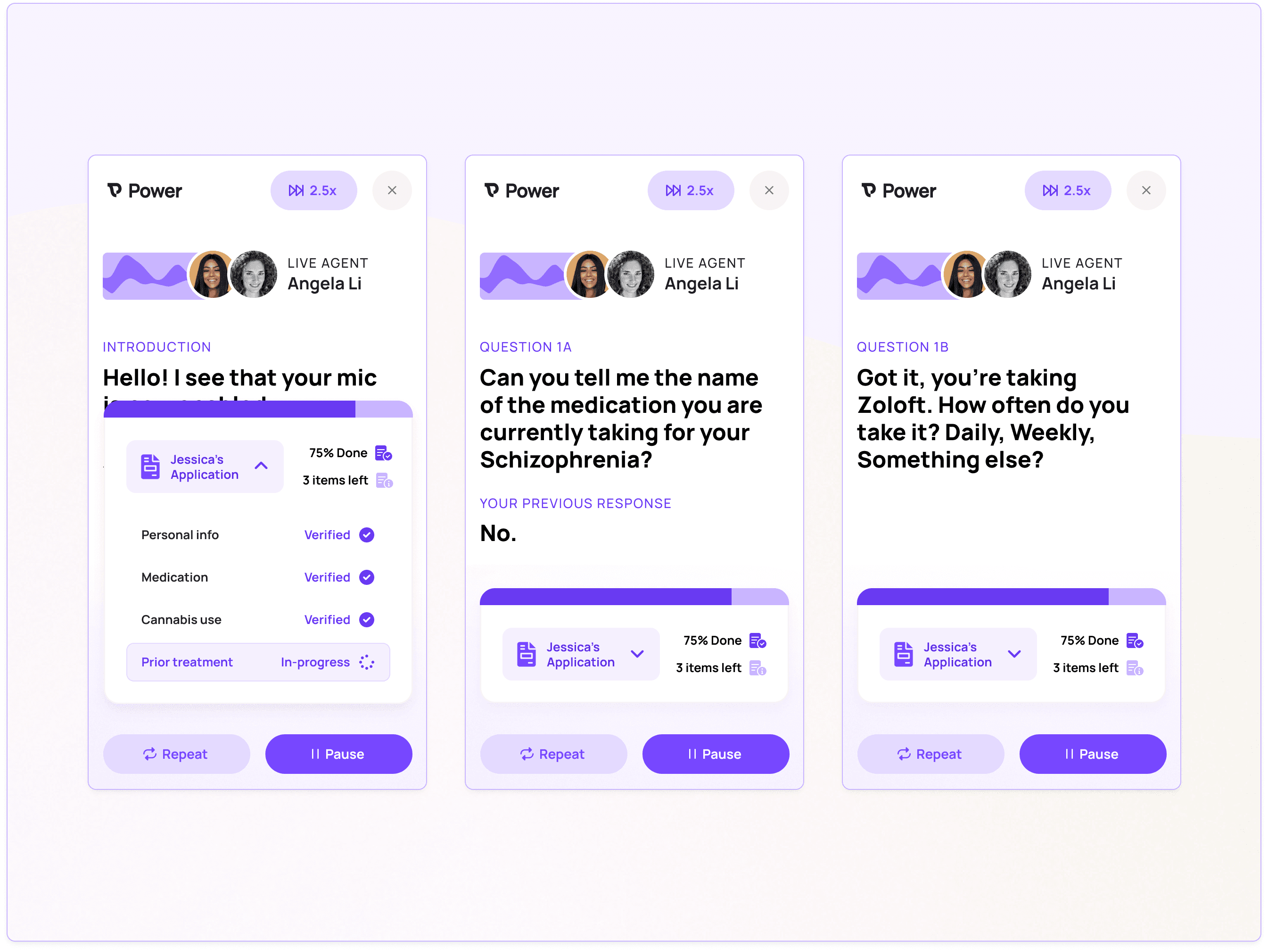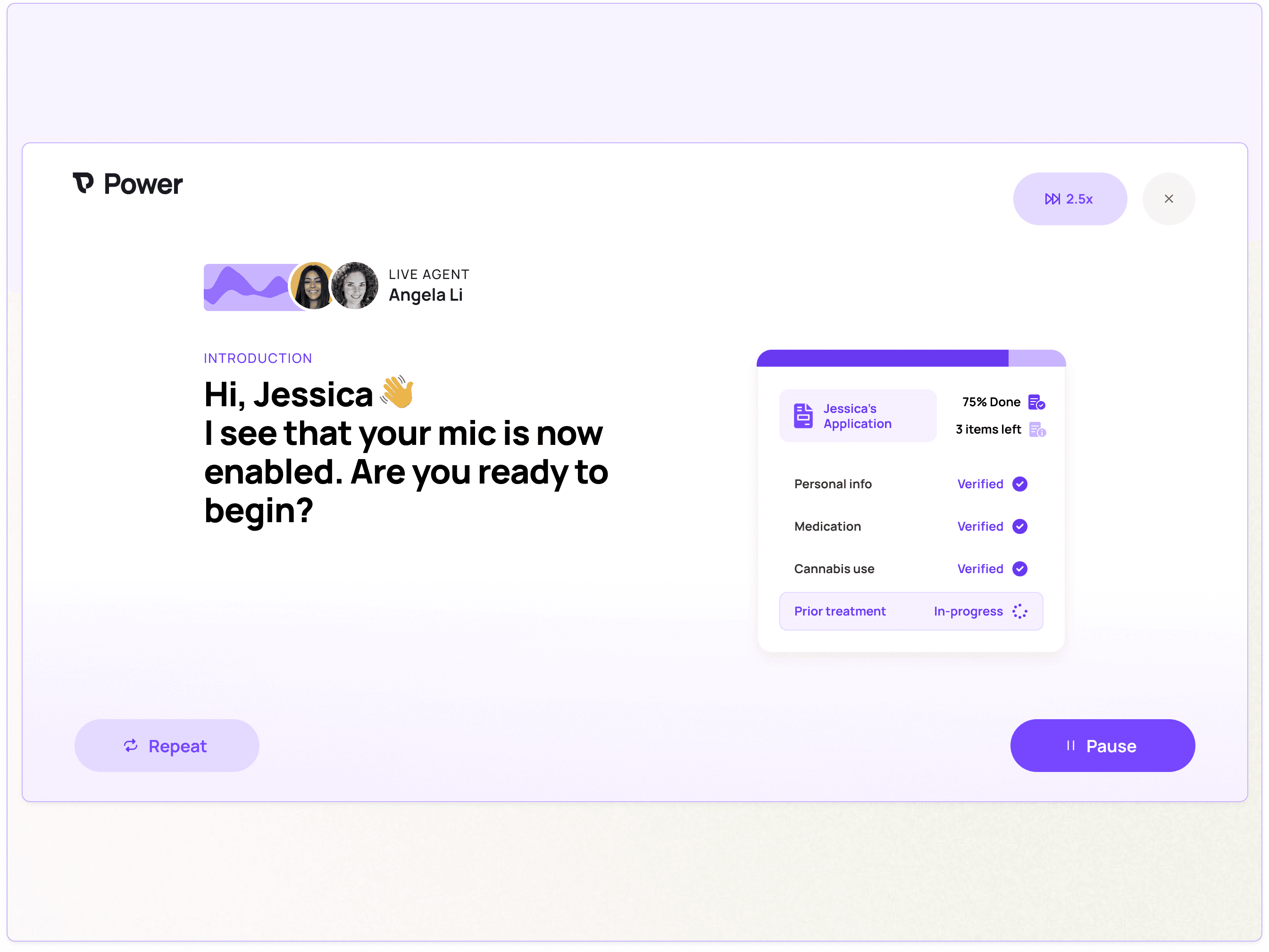This controller is integrated with the AI-powered voice verification experience, which focuses on the sections needing further review. We highlight previous responses that may have been too vague or insufficient, helping the patient understand the level of detail required in their answers. As the AI agent reviews the outstanding details of the application, their questions are typed out in real time, allowing the patient to read and fully understand the required information.