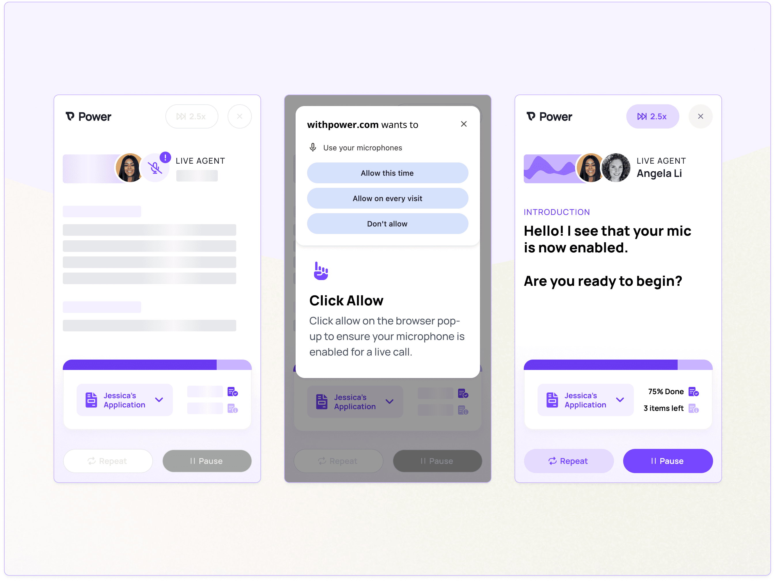 Once the patient continues, they initiate the AI-powered voice verification, and we trigger an opportunity to allow mic access to ensure your mic works and is enabled for a live verification call. We implemented a ghost-loading experience to ensure the experience is active and feels seamless between screens.
