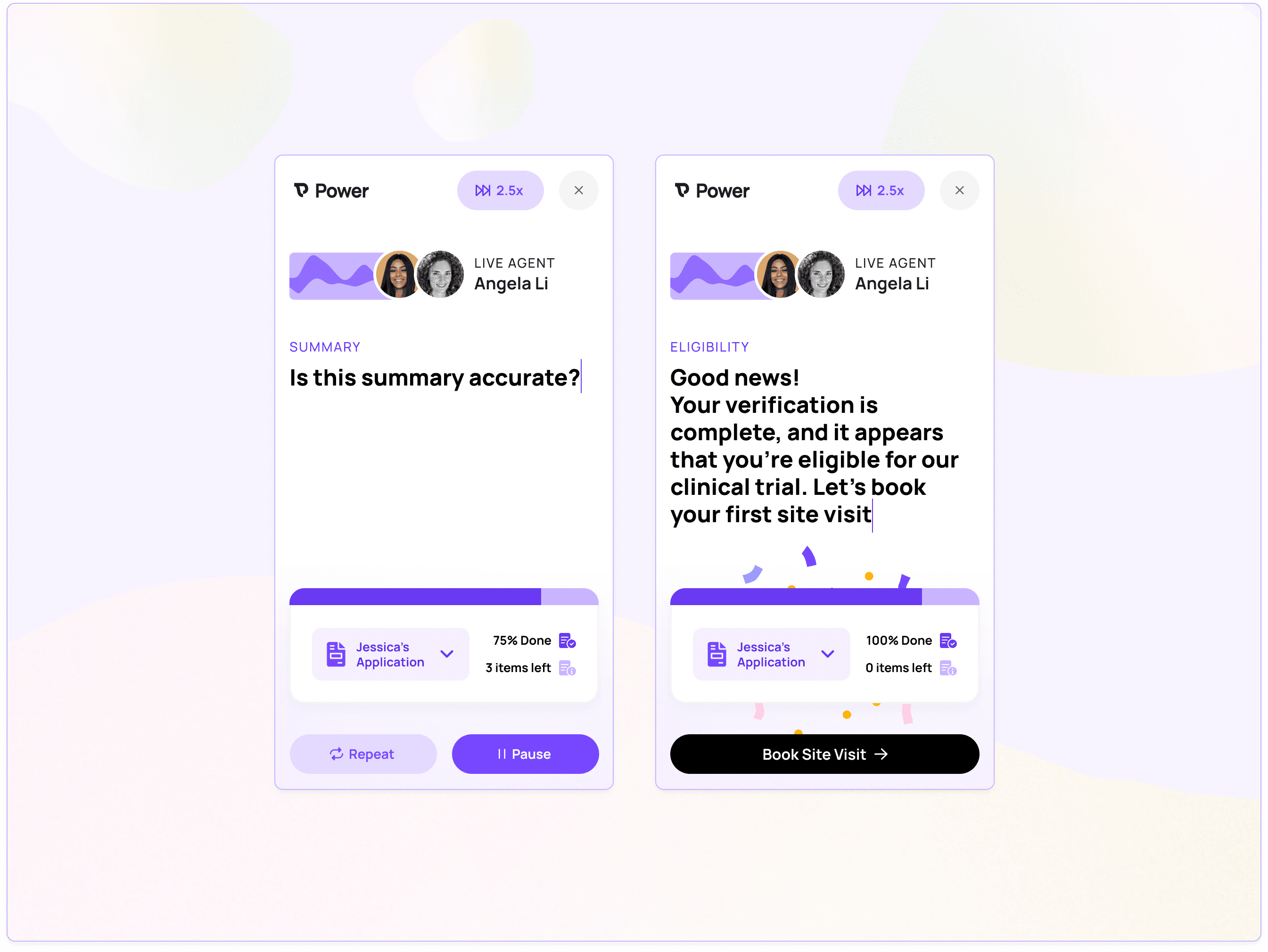 A closer look at how the desktop web version of the Verification Progress Controller and AI verification experience with an agent we train to dig into the details and nuances that complete the eligibility requirements for any given trial.