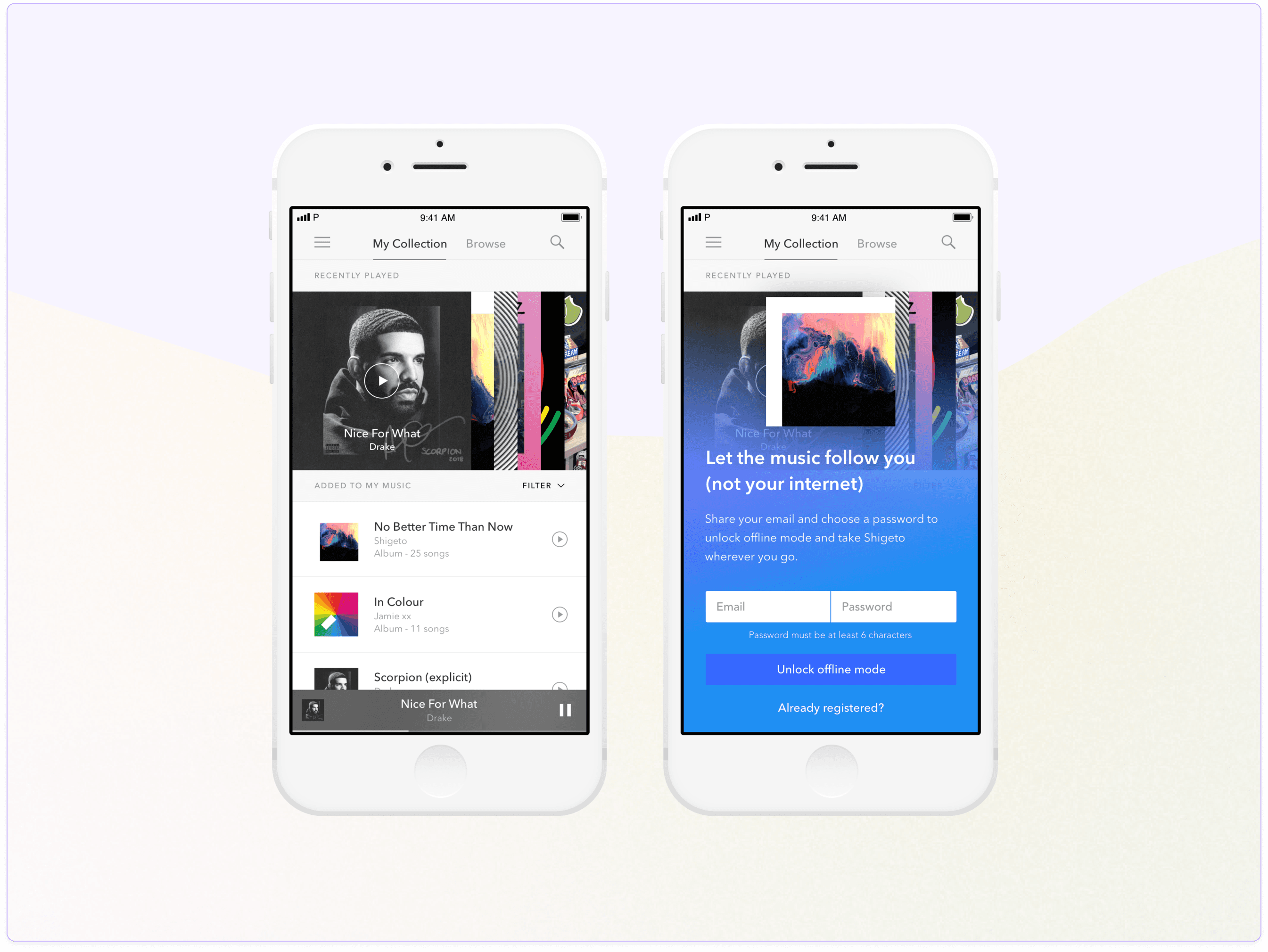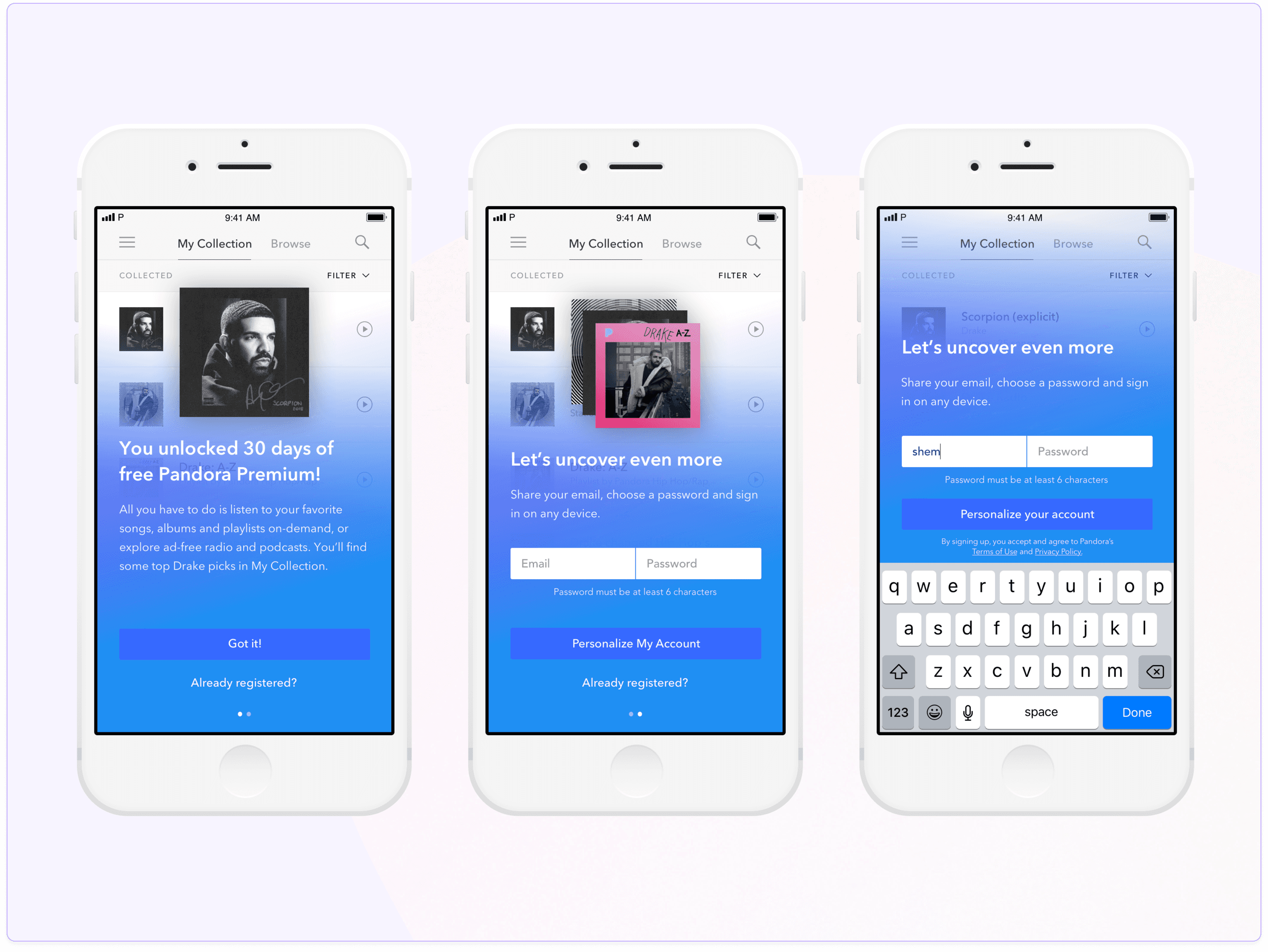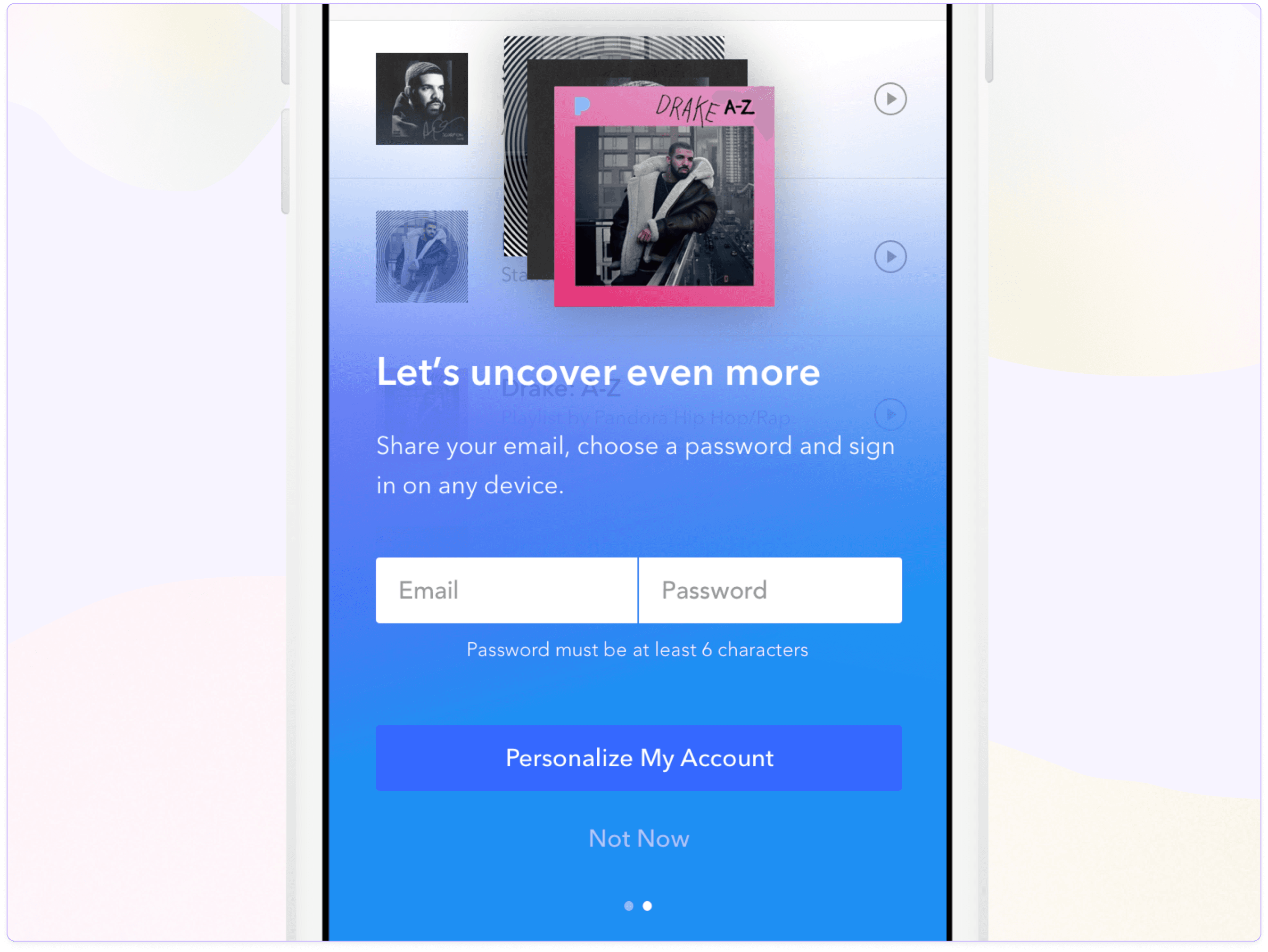 Once the user clicks through the social media link, we deep link into the Pandora app, credential-free. Upon your first experience of Pandora, a modal is presented that sits over a collection of content we’ve populated for you based on the music you’ve clicked on. Given the user is without an account, we offer the ability to credentials right off the bat, to allow users to start personalizing their account.