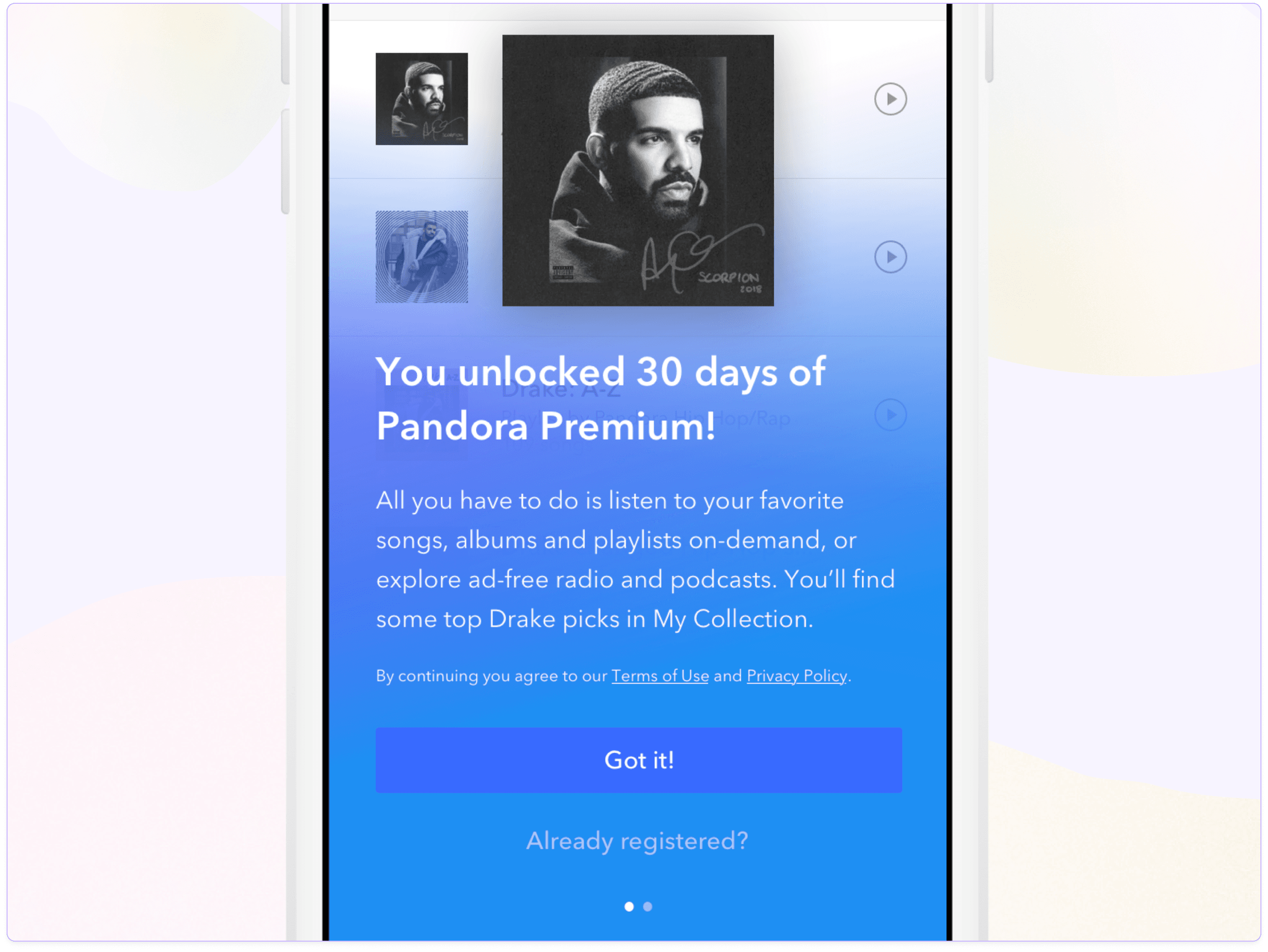 At the end of the 30-day gift, the user is given the option to continue listening, either as a free user or by upgrading to retain the on-demand experience enjoyed by Pandora Premium users.