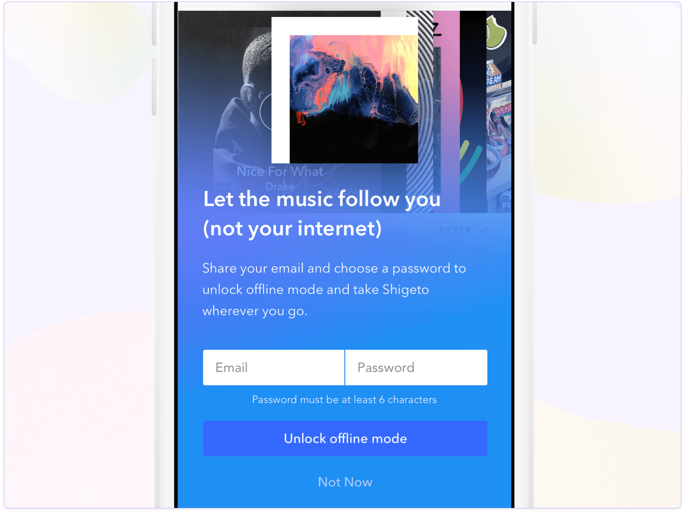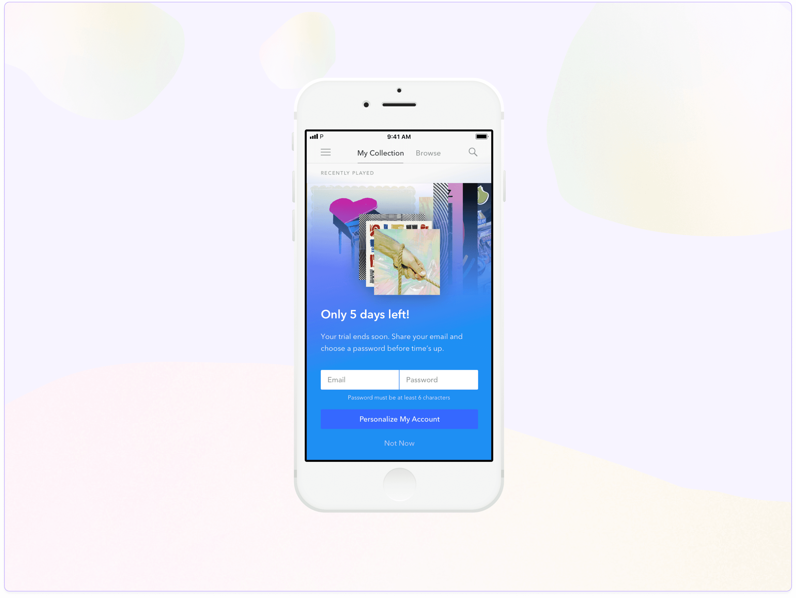 To drive sign-ups, we present an informative modal that educates users about the features they miss out on without creating credentials. This approach emphasizes the premium feature of downloading music for offline access, which allows use without an internet connection. Additionally, we showcase the album artwork of the most-listened-to album during their premium trial, focusing on the content that matters most to them.